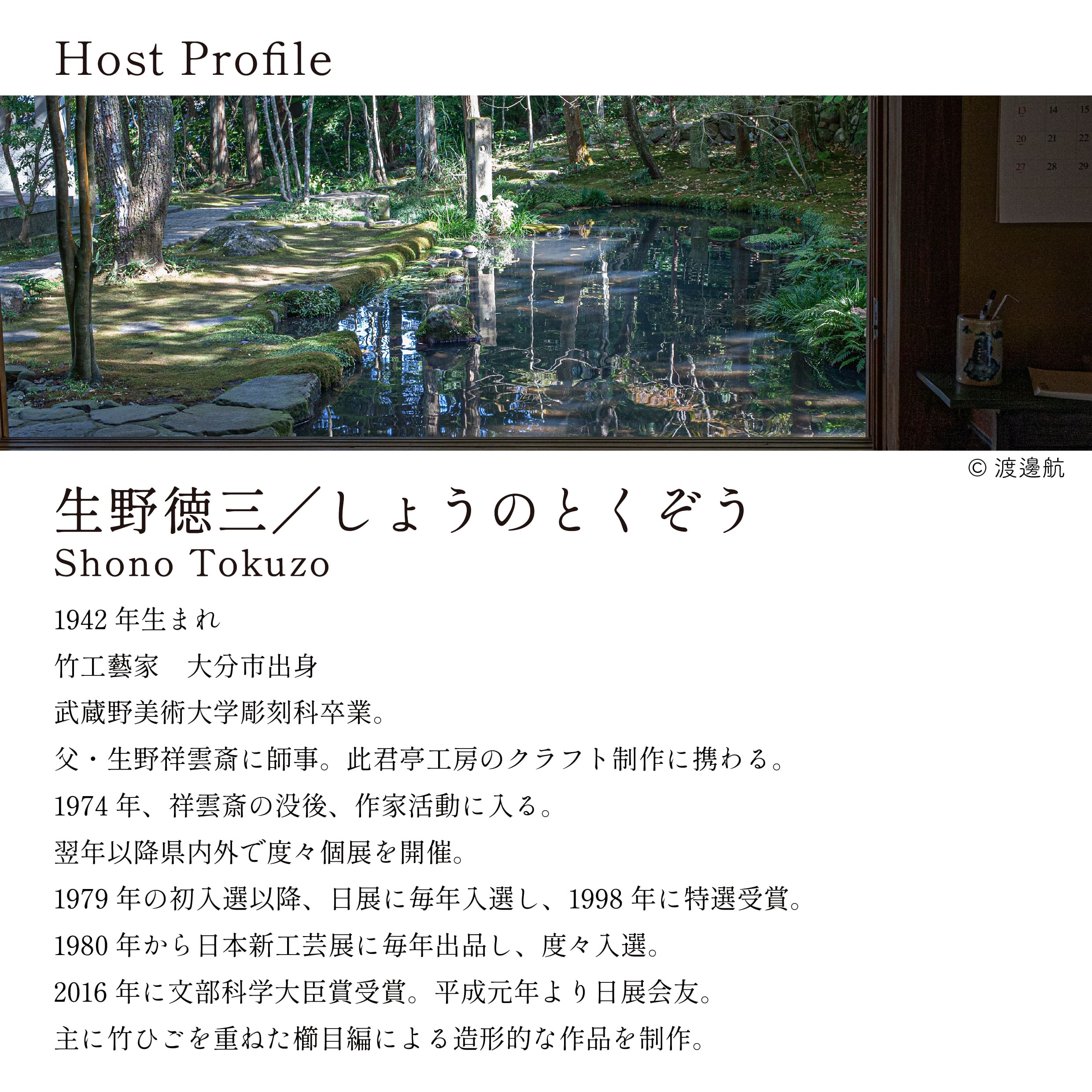 生野徳三さんは1942年生まれ。武蔵野美術大学彫刻科を卒業後、父であり人間国宝の竹工芸家・生野祥雲斎に師事し、此君亭工房のクラフト制作に携わりました。1974年、祥雲斎の没後に作家としての活動を本格的に開始し、翌年以降、県内外で数多くの個展を開催しています。