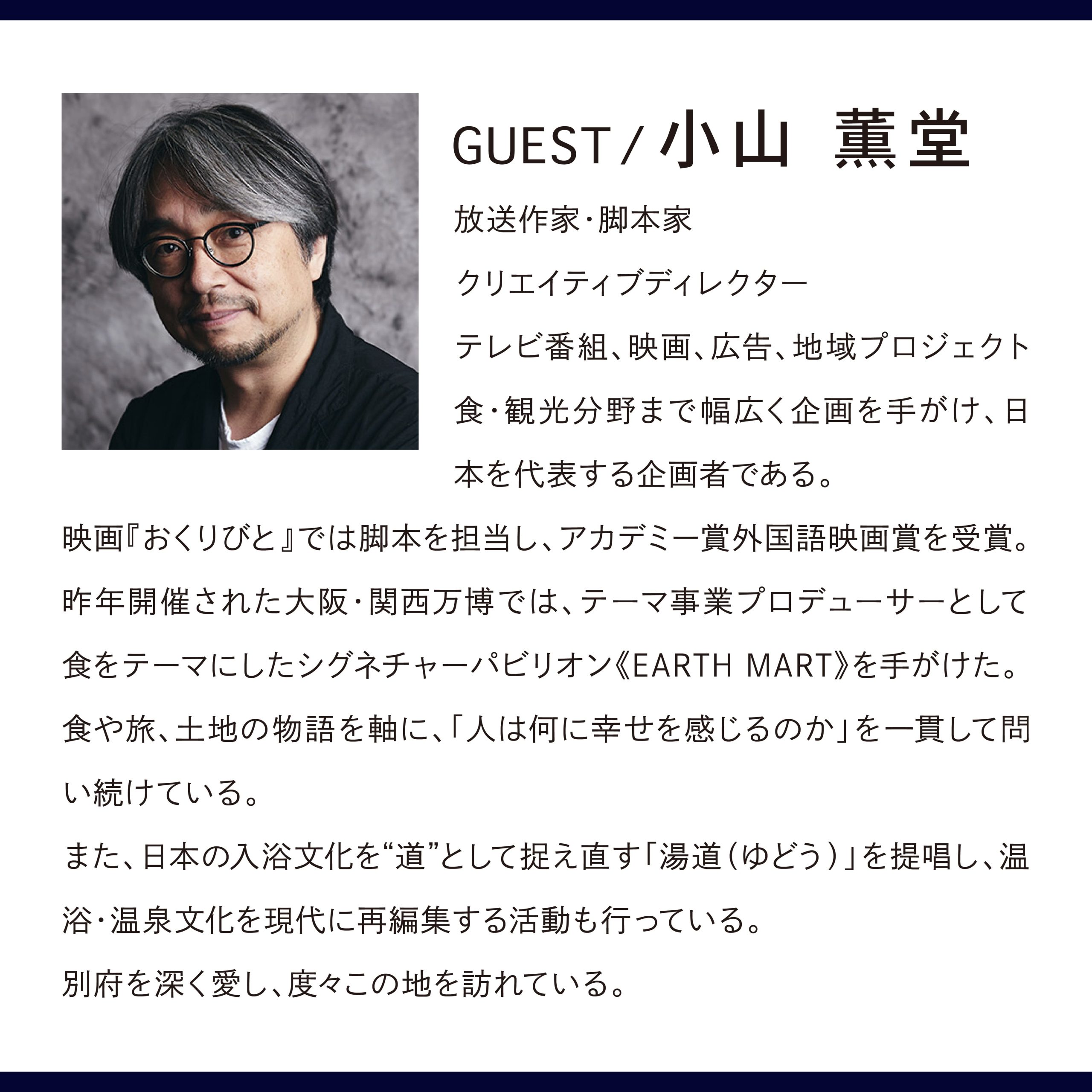 小山薫堂氏は、別府を心から愛し、これまでも度々このまちを訪れてこられた方。温泉、食、文化、そして人のあたたかさ──別府という土地の魅力を深く理解し、発信し続けてこられました。