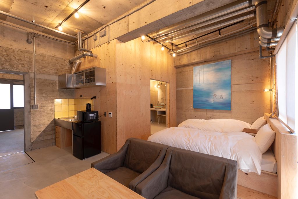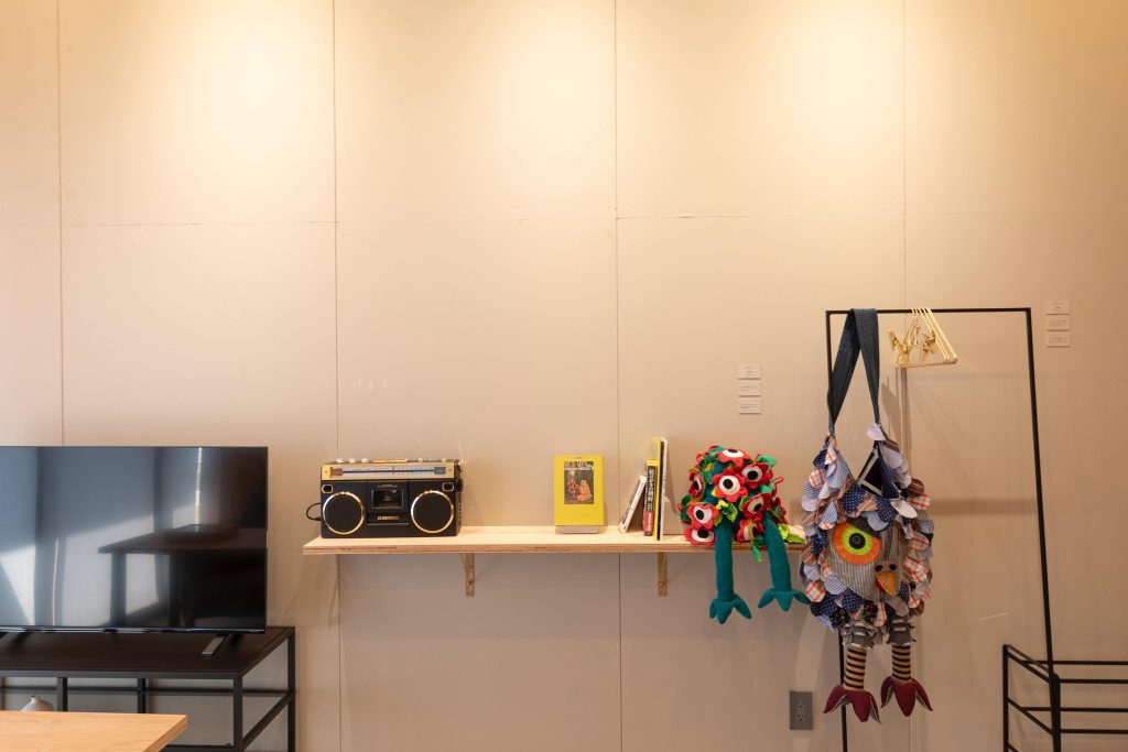 今回ご紹介する客室は【Room 3C】。大分市にアトリエを構える、安部泰輔さんの作品を楽しめるお部屋です。壁面には絵画作品を展示し、古着やハギレを使用した立体作品も展示しています。まちでご利用いただける作品「おふくろうさん」を身に付けて出かければ、不思議な出会いがあるかもしれません。入り口から入るとまず5畳ほどの土間ワークスペースがあります。このワークスペースはデスクワークや制作作業、ミニギャラリーとしてもご利用いただけます。